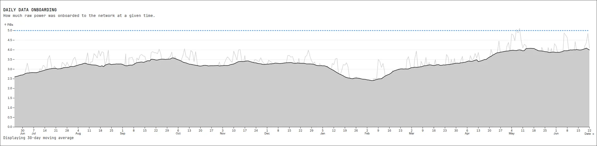 - Daily data onboarding provides the best proxy for actual data storage activity. This metric tracks the daily amount of raw data being onboarded to the Filecoin network, measured in pebibytes (PiBs