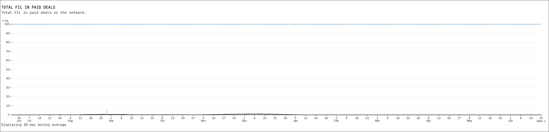 - This metric exclusively tracks storage deals with a storage cost greater than 0.001 FIL, providing a clear indicator of real revenue generation within the ecosystem. It reflects meaningful demand for decentralized storage and the ecosystem's capacity to generate revenue.